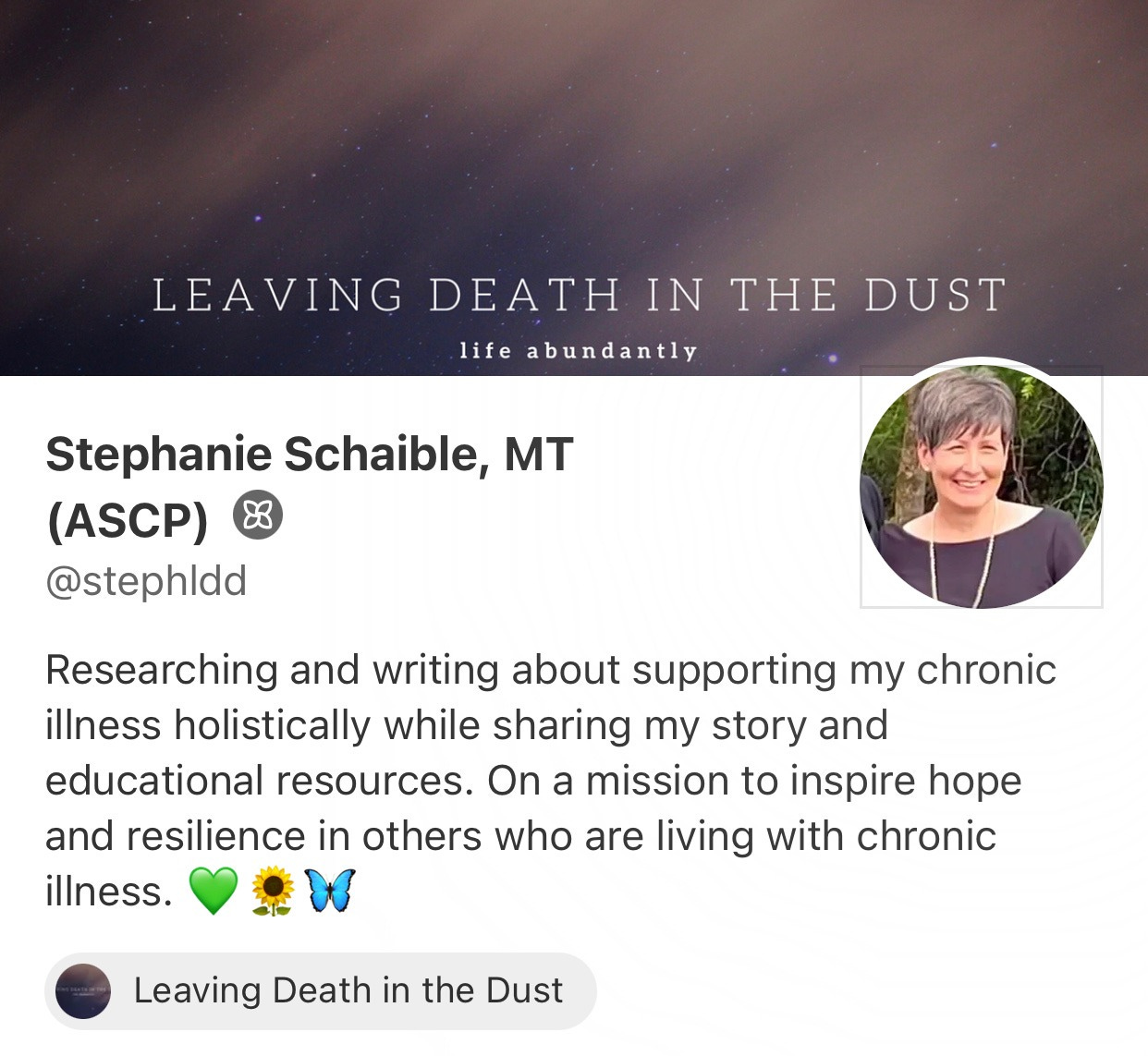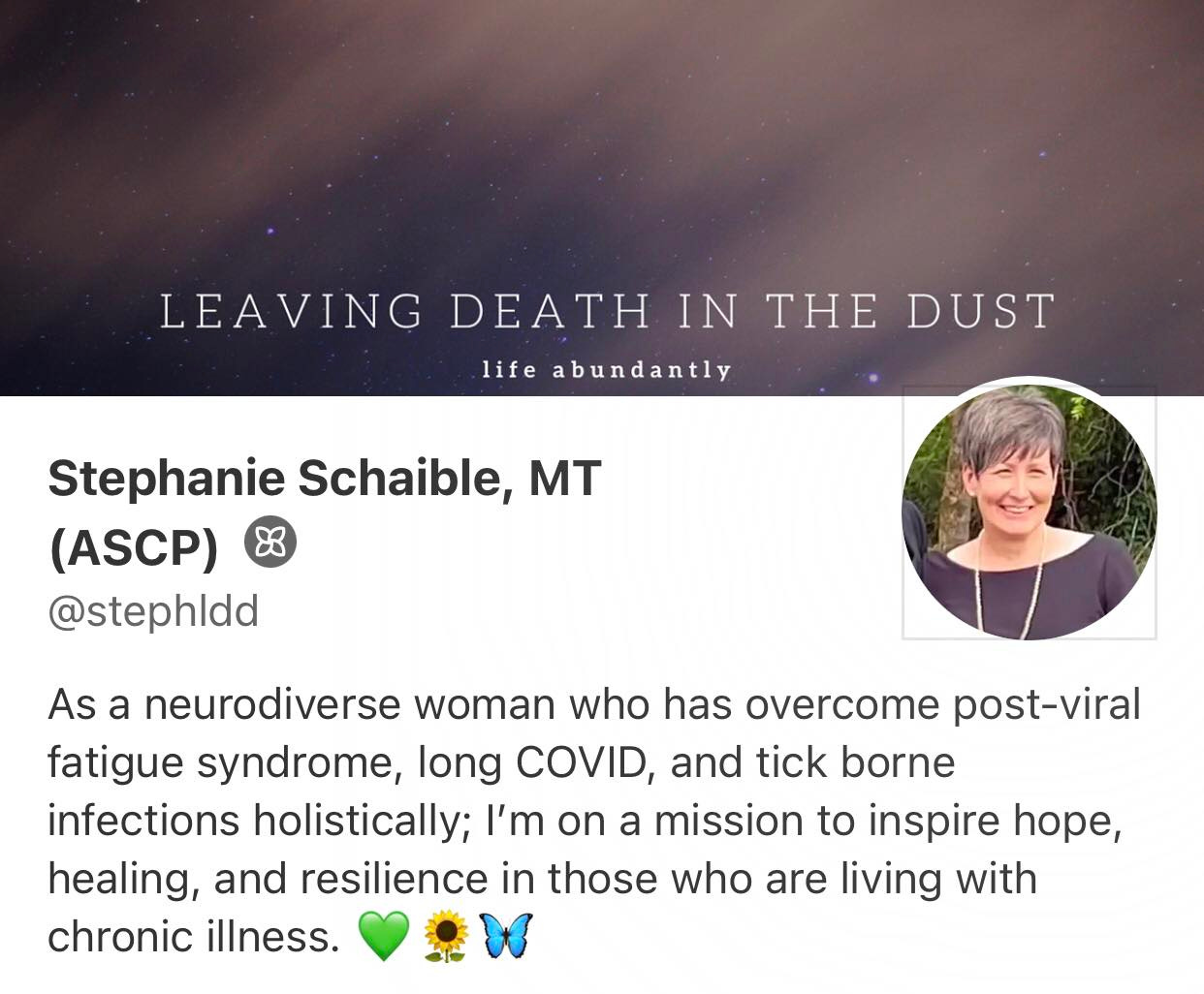 Stephanie Schaible is a former Clinical Laboratory Scientist and online adjunct instructor of Immunohematology (blood banking and transfusion medicine) who has used her curiosity and love of learning to heal and recover from chronic illness. Leaving Death in the Dust is a publication for the sharing of what she has learned. *Anything you learn here is not a replacement for professional healthcare, this is informational and educational only. I am not your healthcare provider and whatever you find here is not to be confused with the establishment of a patient/provider relationship or to be considered as medical advice. **That is an MT behind my name not an MD.